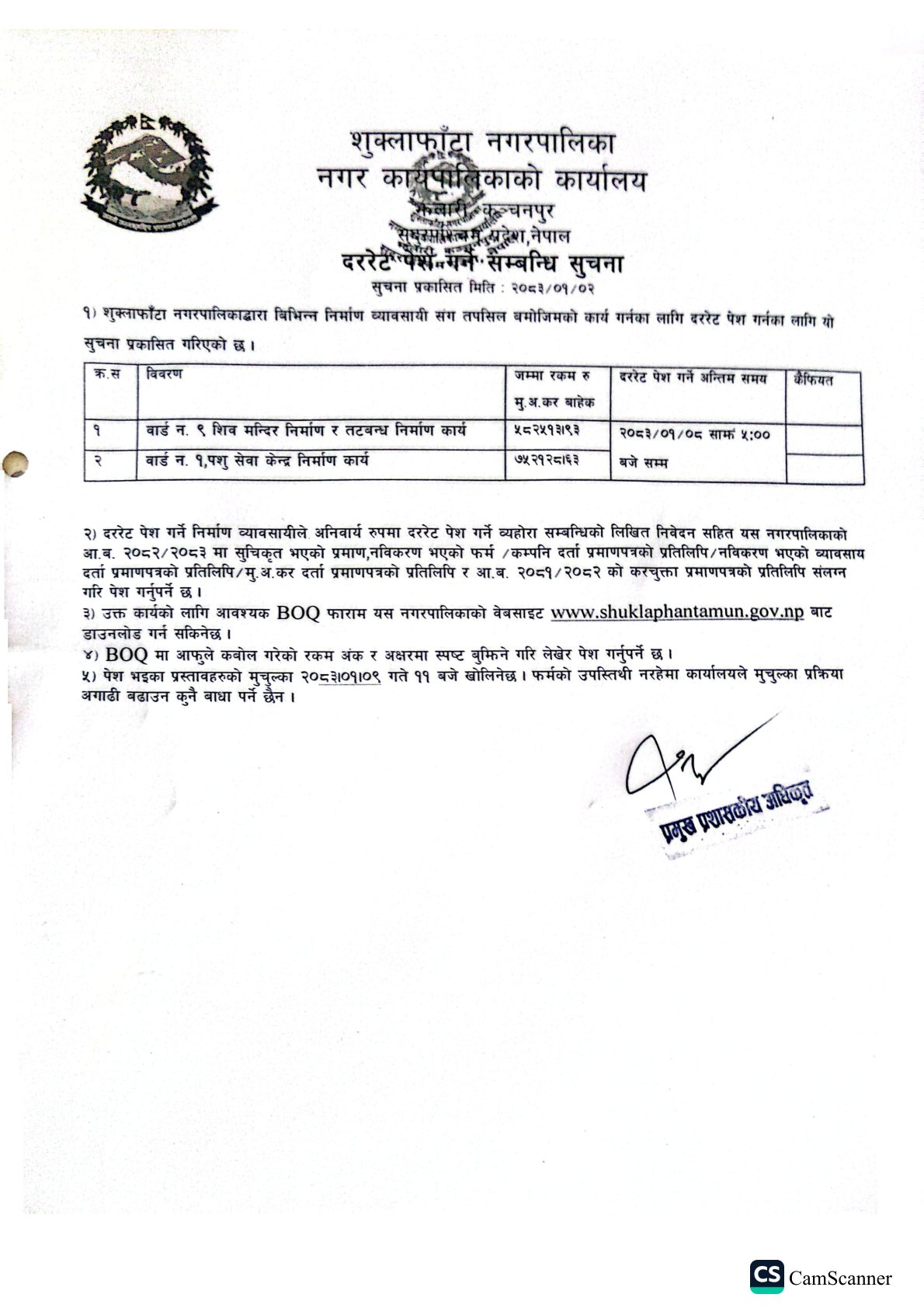 Shuklaphanta Municipality, Office of Municipal Executive