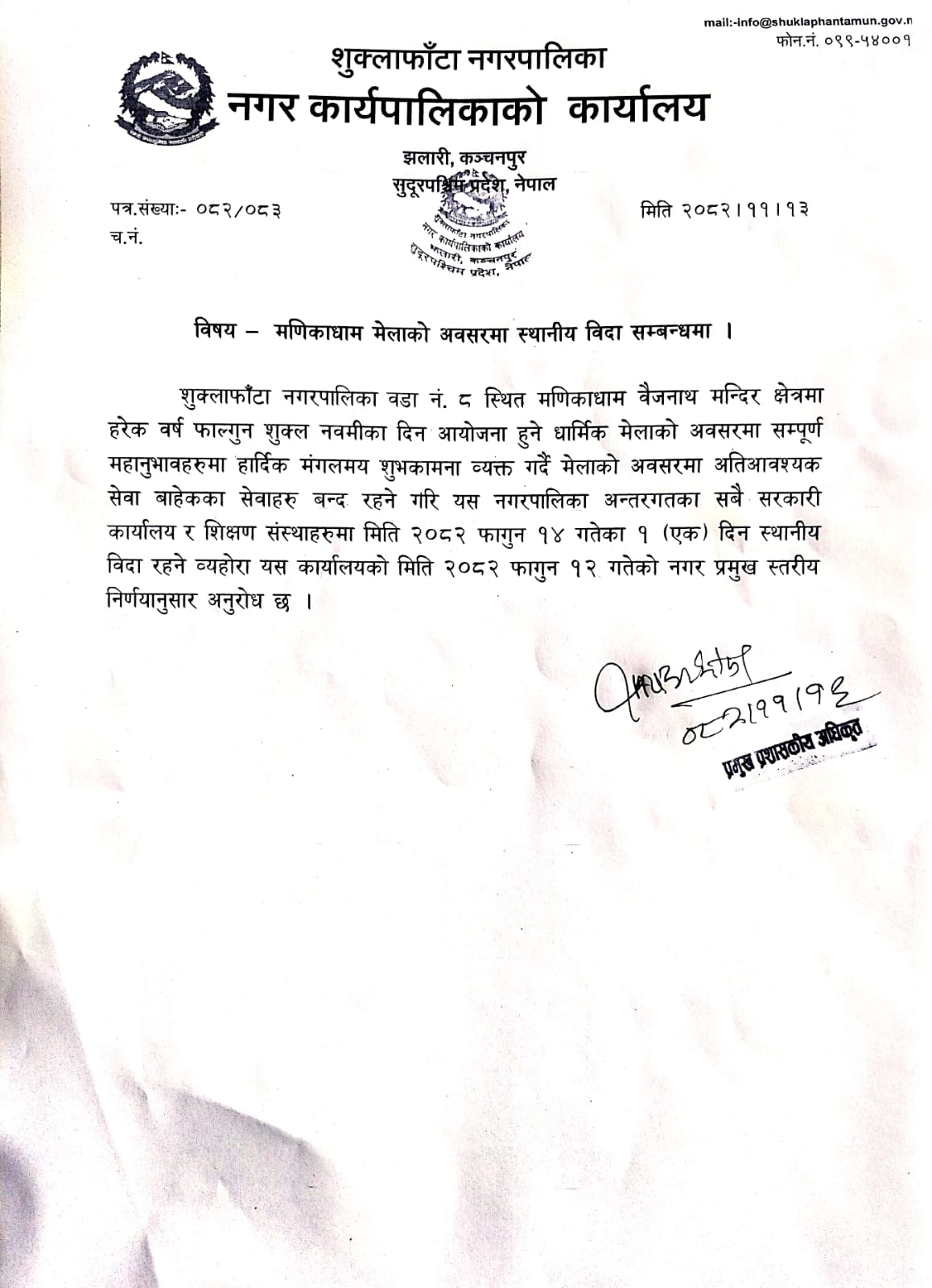 मणिकाधाम मेलाको अवसरमा स्थानीय विदा सम्बन्धमा