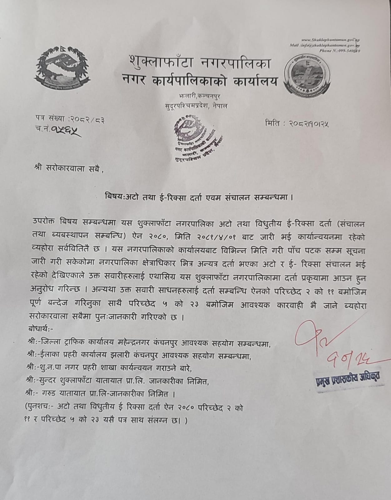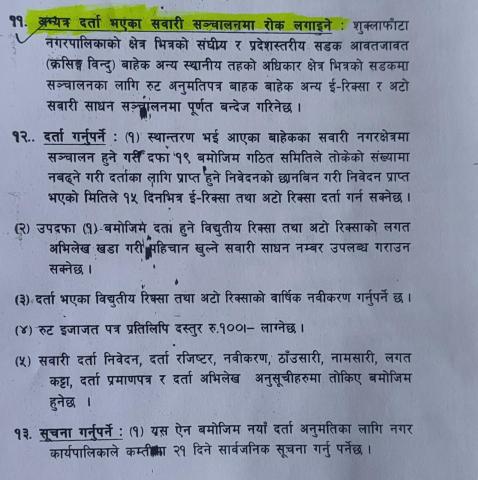 अटो तथा ई सिक्सा दर्ता एवं संचालन सम्बन्धमा