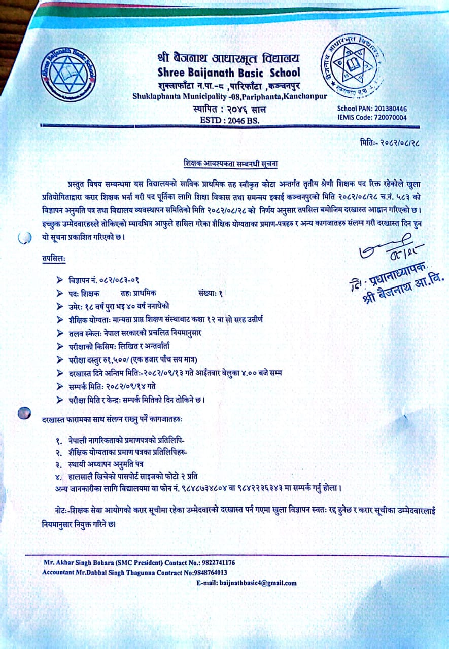 » शिक्षक आवश्यकता सम्बन्धी सूचना