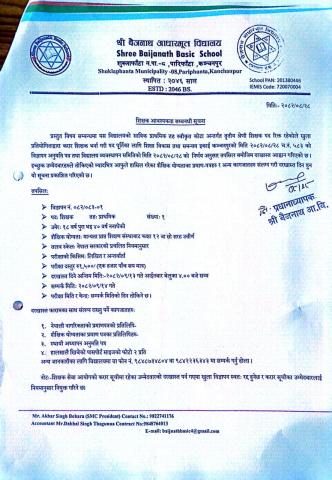 शिक्षक आवश्यकता सम्बन्धी सूचना