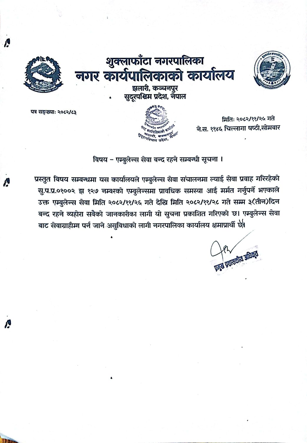 » एम्बुलेन्स सेवा वन्द रहने सम्बन्धि सूचना