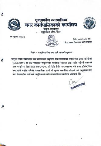एम्बुलेन्स सेवा वन्द रहने सम्बन्धि सूचना