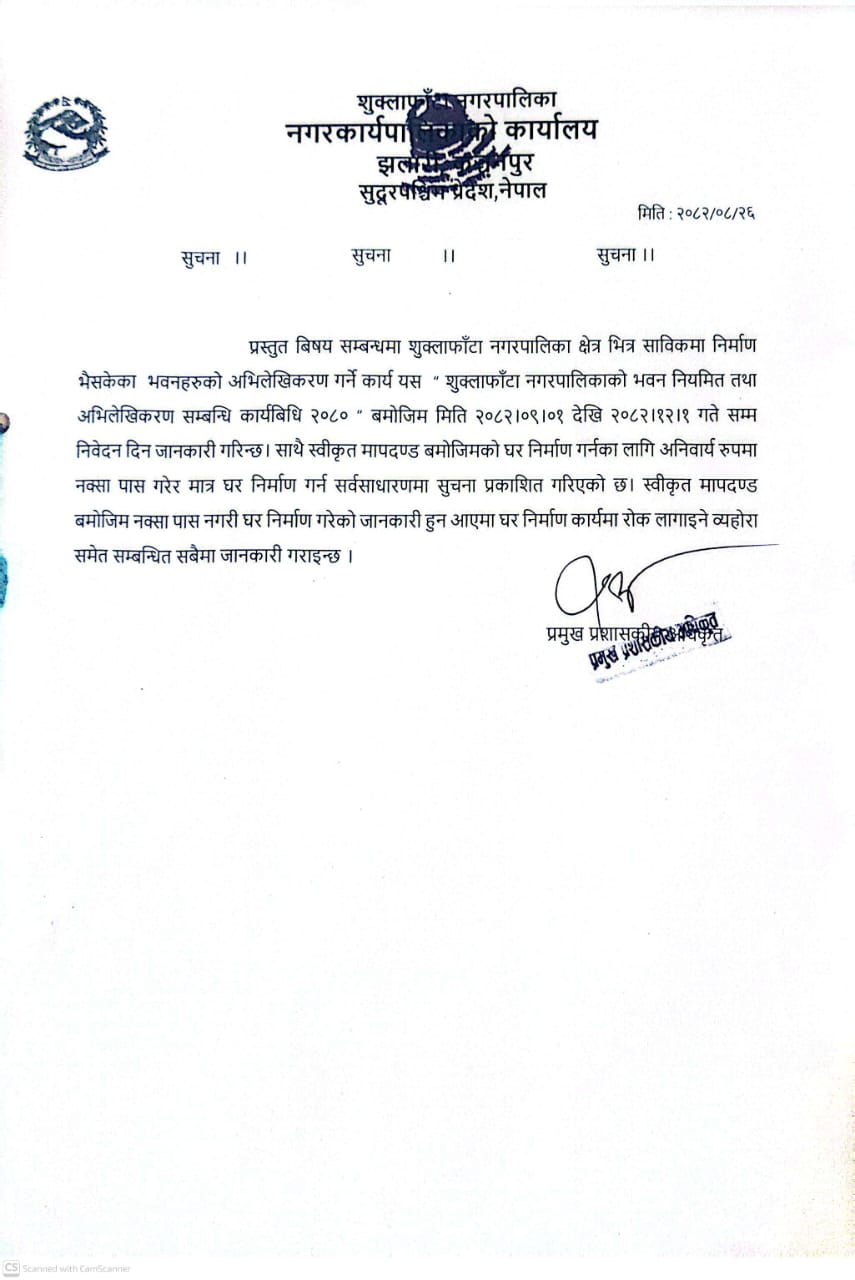 घर नक्सा अभिलेखिकरणको लागी निवेदन पेश गर्ने बारेको सूचना
