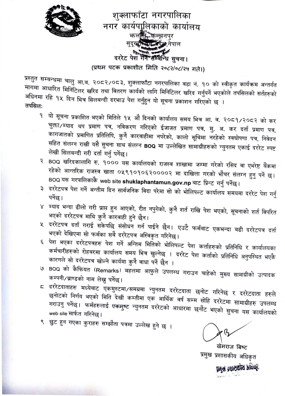 दररेट पेश गर्ने सम्बन्धि सूचना- मिनिटिलर