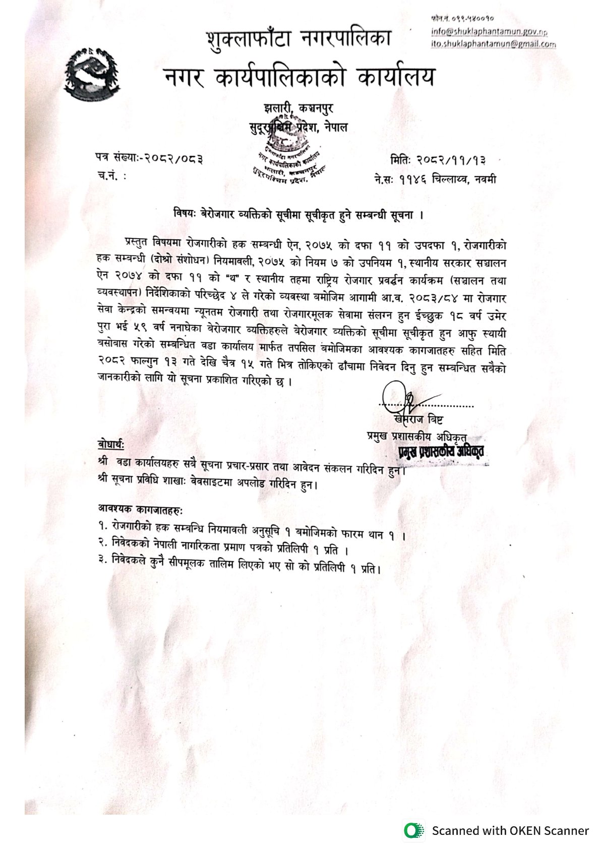 बेरोजगार व्यक्तिको सूचीमा सूचीकृत हुने सम्बन्धि सूचना